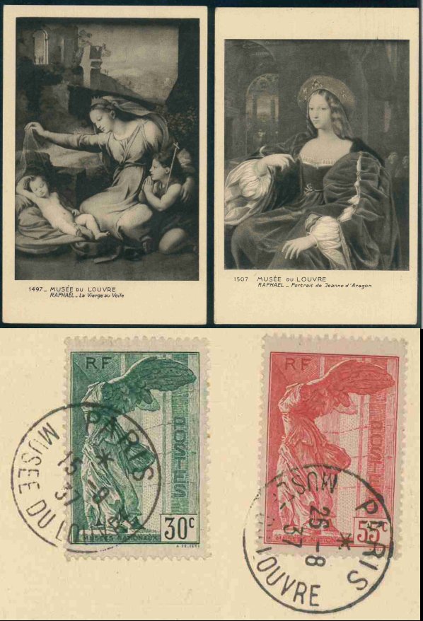 FRANKREICH Mi. 359/60 'Nationalmuseen' auf 2 illustr. Postkarten, Sonderstempel 'Musée du Louvre'