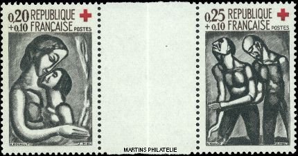 Rotes Kreuz : 1961 - Zwischenstegpaar; die Paare mit Zwischensteg entstammen Heftchenblättern, die in gefaltet verausgabte Markenhefte eingeklebt wurden. Daher haben alle Zwischenstege immer eine vertikale Bugspur und Haftstellen (cf. Rubrik "ROT-KREUZ-MARKENHEFTE).