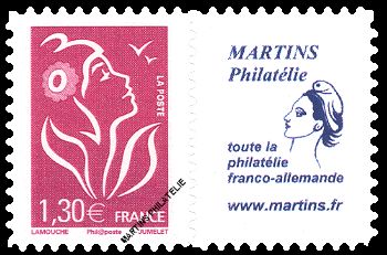 Marianne de Lamouche : 1.30 € lilakarmin,selbstklebende Marke mit Lacküberzug und mit Stecherzeichen ''phil@poste'' und Werbeanhängsel (Abbildung des Logos nicht verbindlich)